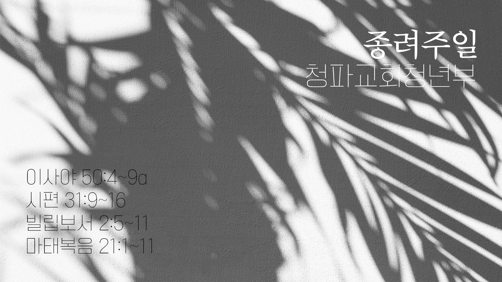 오늘날 종려주일을 지키는 많은 교회에서 발견되는 한 가지 해석적 경향이 있습니다. 그것은 사람들의 환호를 뚫고 지나가는 '예수님의 슬픔에' 지나치게 주목하는 것입니다. 물론 틀린 말은 아닙니다. 예루살렘 입성은 고난으로 향하는 길이었고, 호산나를 외치며 따르는 행복한 군중들은 머지않아 주님을 욕하고 그를 십자가에 못 박으라 외치는 성난 군중으로 돌변하기 때문입니다.